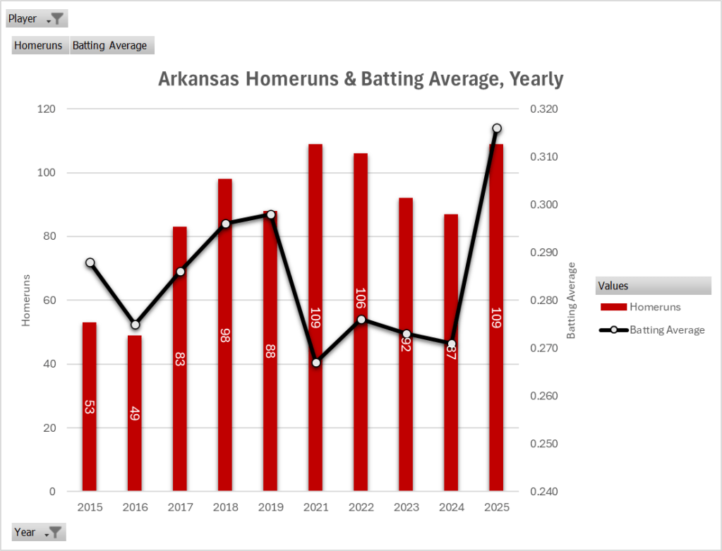 Read more: The Power of Arkansas HittingFirst, let’s look at the most basic baseball stats everyone knows – number of homeruns and batting average. From the graph below, I have pulled the data from 2015 to 2025. This 2025 team will end the year not only with the most homers in the last 10 years but also the highest batting average. That should be a good sign going into postseason. If you compare the .316 average to the last 2 National Champions (LSU and Tennessee), it is similar – .310 for Tenn and .308 for LSU. This is a significant improvement from the previous years, and you can see a significant flaw in those 2021-2022 teams, as exciting as they were.