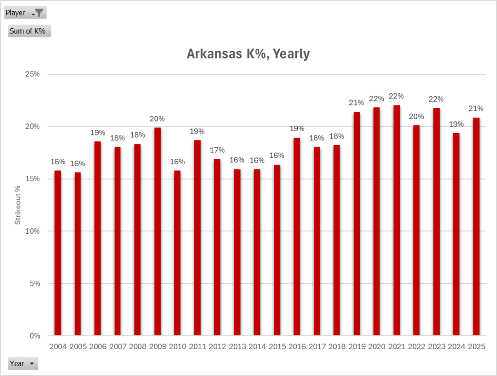What could be the downfall of this team? Obviously, there is a luck factor, and they could go forward with a low Batting Average on Balls In Play (BABIP) – just meaning they are finding gloves when they hit. I have found another interesting stat though – Strikeout %. Since 2018, Arkansas has been consistently over 20% K rate, which is strikeouts divided by Plate Appearances. So a higher number of Plate Appearances end up in strikeouts. This trend has continued into 2025. This is the Nate Thompson Effect. While homers and slugging % have significantly increased since Thompson joined in 2018, the strikeouts have gone up. To note, Tony Vitello was hitting coach until 2017. It could be trouble if Arkansas faces a crafty pitcher that gets a lot of strike outs.